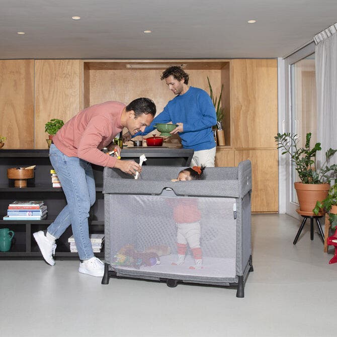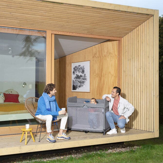 Nuestra auténtica revolución para la hora de acostarse y jugar. Nuestra cuna de viaje se despliega en un segundo y se vuelve a plegar en tres, ¡con colchón y todo!